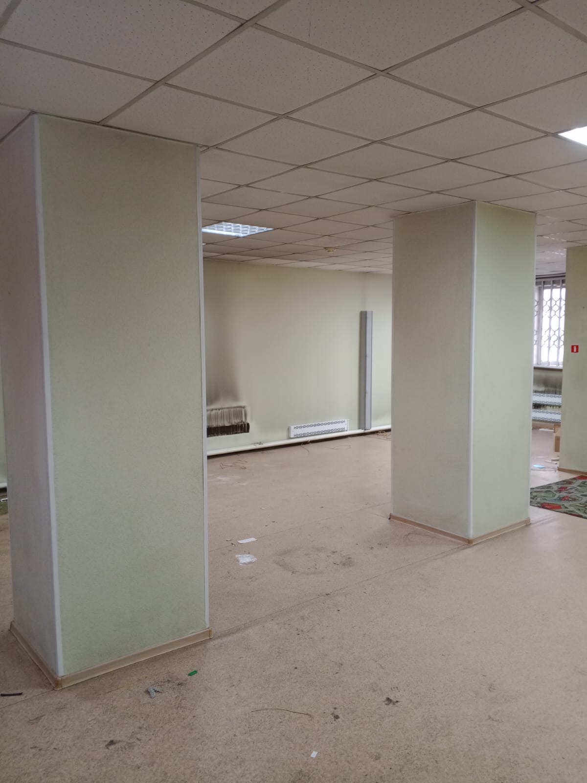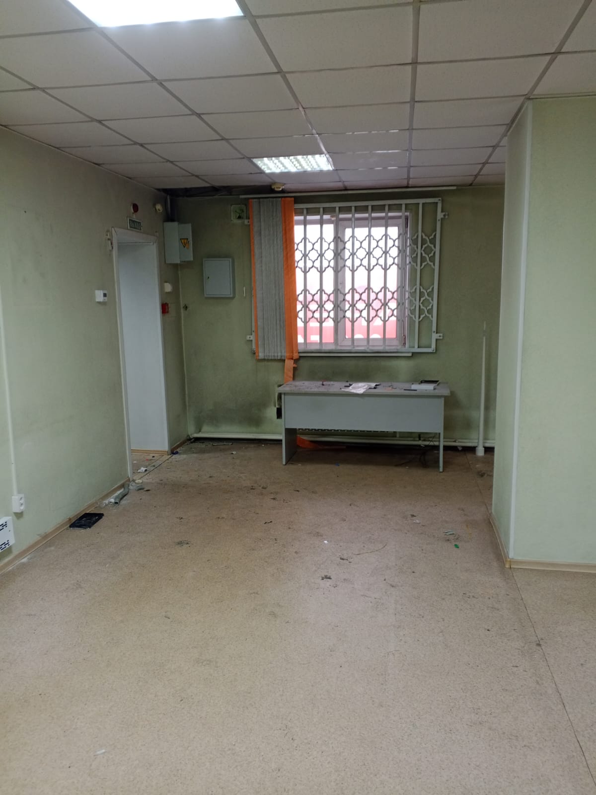 Согласно произведенному осмотру: в помещении имеется холл+5 отдельных комнат. Одна из комнат - укрепленное сейфовое помещение (ранее размещалось отделение Сбербанка). Окна с решетками; Требуется косметический ремонт.