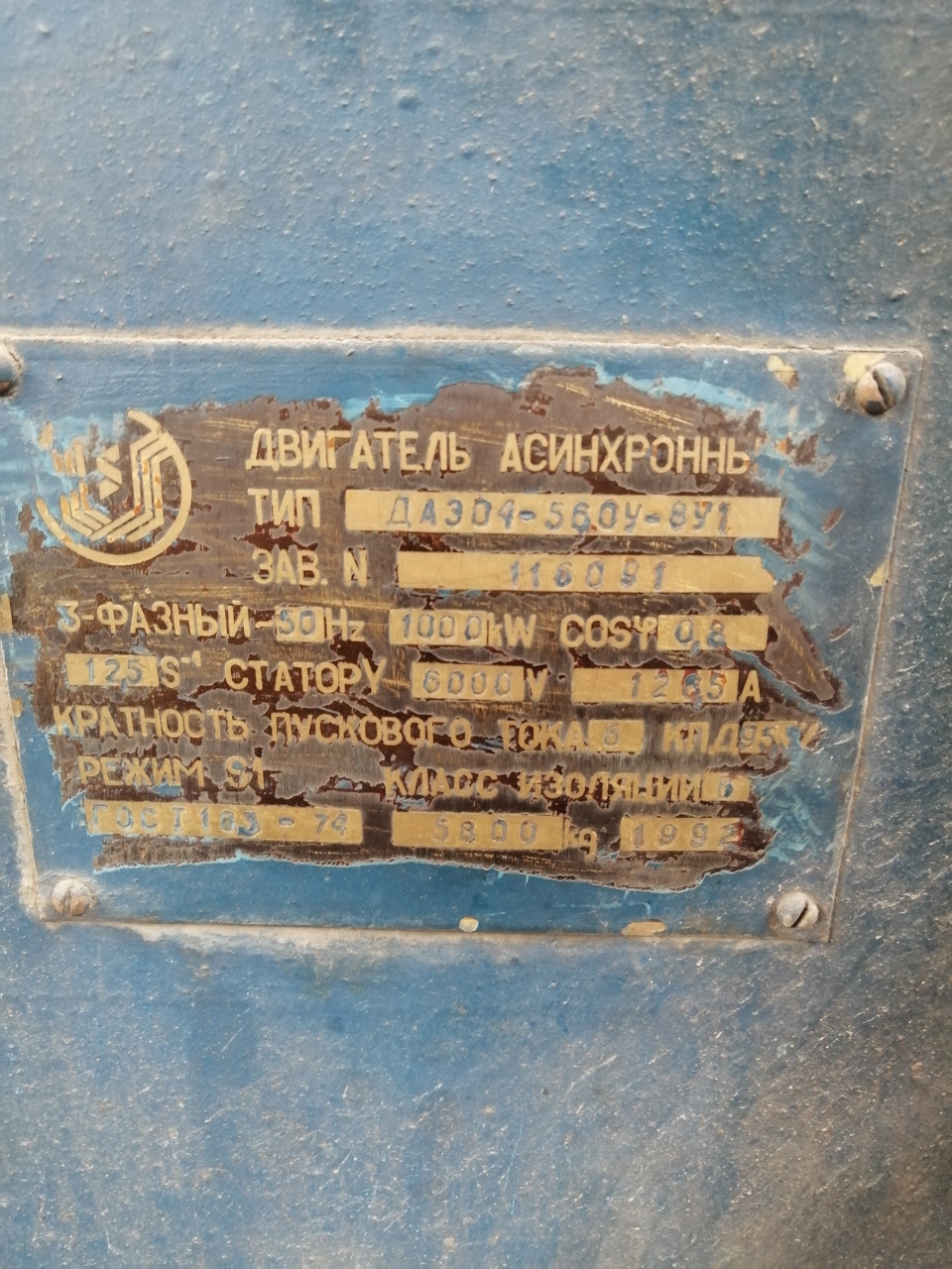 Просим обратить внимание на фактический шильд двигателя с обозначением ДАЗО4-560У-8У1 и мощностью 1000kw.